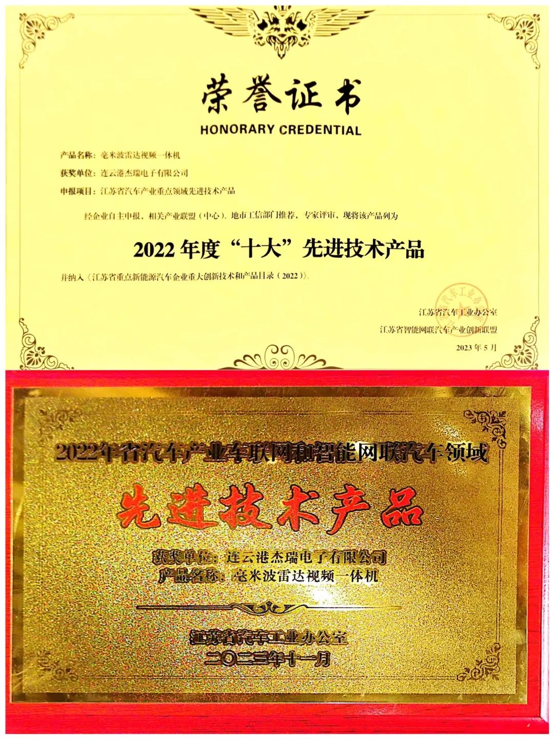 11月17日,2023年江蘇省車聯網和智能網聯汽車產業創新發展大會在南京江寧開發區隆重舉行,子公司傑瑞電子憑借自主研發的“毫米波雷達視頻一體機”榮獲2022年度“十大”先進技術產品獎,並被納入《江蘇省重點新能源汽車企業重大創新技術和產品名錄(2022)》。
