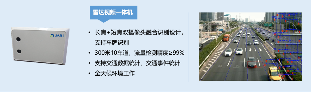 傑瑞雷達視頻一體機以自研毫米波雷達模組為基礎,融合長焦+短焦雙視頻識別相機,通過對2路視頻流和1路毫米波雷達點雲數據實時融合分析,精準獲取檢測目標的位置坐標、速度、航向角等運行數據,進而獲取車流量、排隊長度、平均速度、車頭時距、停車次數等多種交通數據,可對交通事件進行檢測並報警輸出。產品麵向城市道路、高速公路、智能網聯等場景,檢測區域覆蓋300米10車道,實現全天候、高精度、多目標的人、車、路、環信息實時融合感知分析,服務於城市交通管理、信號控製、交通誘導、車路協同路側交通狀態感知等業務應用。
