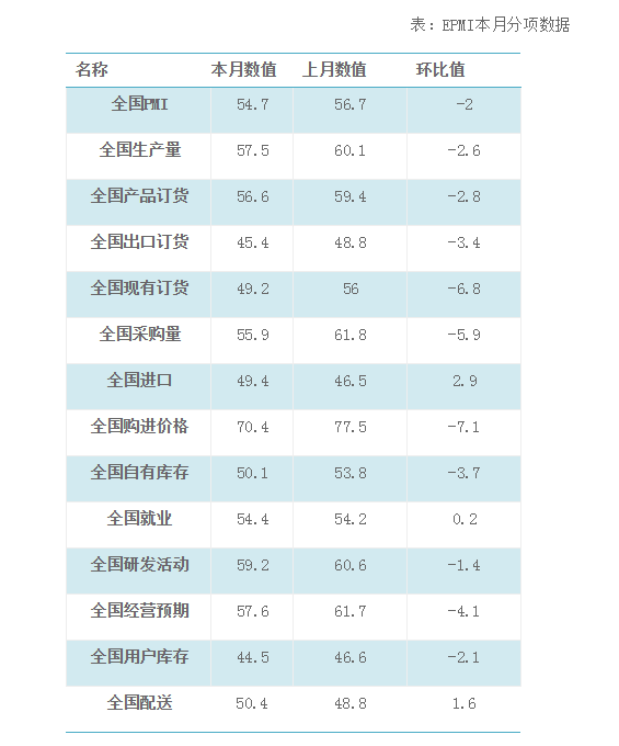 具體觀察各項指標,PMI指標為54.7%,比上月回落2個百分點。生產量指標為57.5%,比上月回落2.6個百分點。產品訂貨指標為56.6%,比上月回落2.8個百分點。進口指標為49.4%,比上月回升2.9個百分點。自有庫存指標為50.1%,比上月回落3.7個百分點。就業指標為54.4%,比上月回升0.2個百分點。