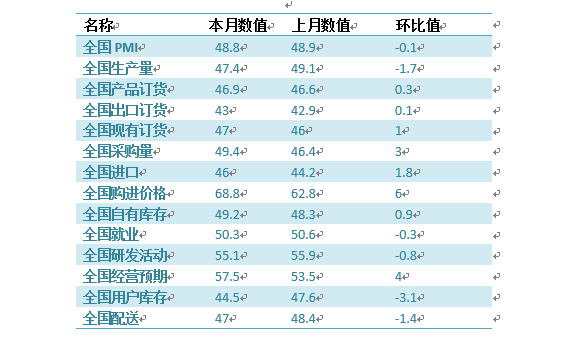 具體觀察各項指標,PMI指標為48.8%,比上月回落0.1個百分點。生產量指標為47.4%,比上月回落1.7個百分點。產品訂貨指標為46.9%,比上月回升0.3個百分點。進口指標為46%,比上月回升1.8個百分點。自有庫存指標為49.2%,比上月回升0.9個百分點。就業指標為50.3%,比上月回落0.3個百分點。