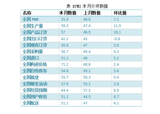 具體觀察各項指標,PMI指標為55.9%,比上月回升7.1個百分點。生產量指標為59.3%,比上月回升11.9個百分點。產品訂貨指標為57%,比上月回升10.1個百分點。進口指標為51.2%,比上月回升5.2個百分點。自有庫存指標為54.8%,比上月回升5.6個百分點。就業指標為55.7%,比上月回升5.4個百分點。