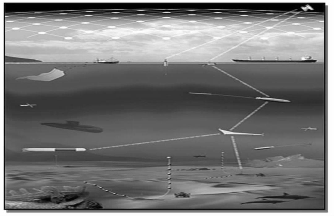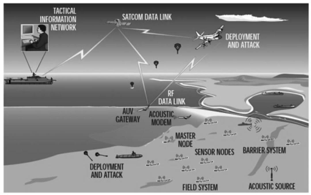 20世紀80年代後期,美國開始研製和部署采用光纖傳輸和局域網技術的分布式固定監視係統,主要包括固定式分布係統(FDS)和先進可部署係統(ADS),同時,為彌補固定式陣列的不足,美海軍先後發展了艦載拖曳陣監視係統(SURTASS)和多功能拖曳陣列(MFTA),裝備在水麵艦船上,彌補固定式探測陣列無法移動的缺陷。上述固定式和拖曳式裝備共同構成了綜合水下監視係統(IUSS)。20世紀90年代開始,由於無線傳感器網絡的發展,美海軍又將水下信息感知的重點聚焦到網絡化反潛預警方麵,“廣域海網”(Seaweb)、“近海水下持續監視網絡”(PLUSNet)、可部署自動分布式係統(DADS)就是其中的代表。“廣域海網”是美海軍基於“網絡中心戰”思想建設的“部隊網”的水下部分。目的是通過可靠的傳輸鏈路,將傳感器網絡、信息網絡與作戰網絡進行合成,使每一個傳感器、每一艘艦艇、每一架飛機都能成為體係中的一個節點;通過可靠的通信鏈路,各個固定或移動節點均可自由地接入網絡,快速準確地發送、接收信息,實現各平台、節點之間的通信,並能在出現故障的情況下自我修複,從而構成跨係統、跨任務、跨平台、跨國的綜合性分布自主式水下作戰信息網絡體係,實現對水下作戰信息的廣泛獲取、自由聯通、高度集成融合、交互共享和應用,為淺海複雜環境下對安靜型潛艇實施作戰提供有力的信息支持,以奪取近海水下作戰空間優勢。