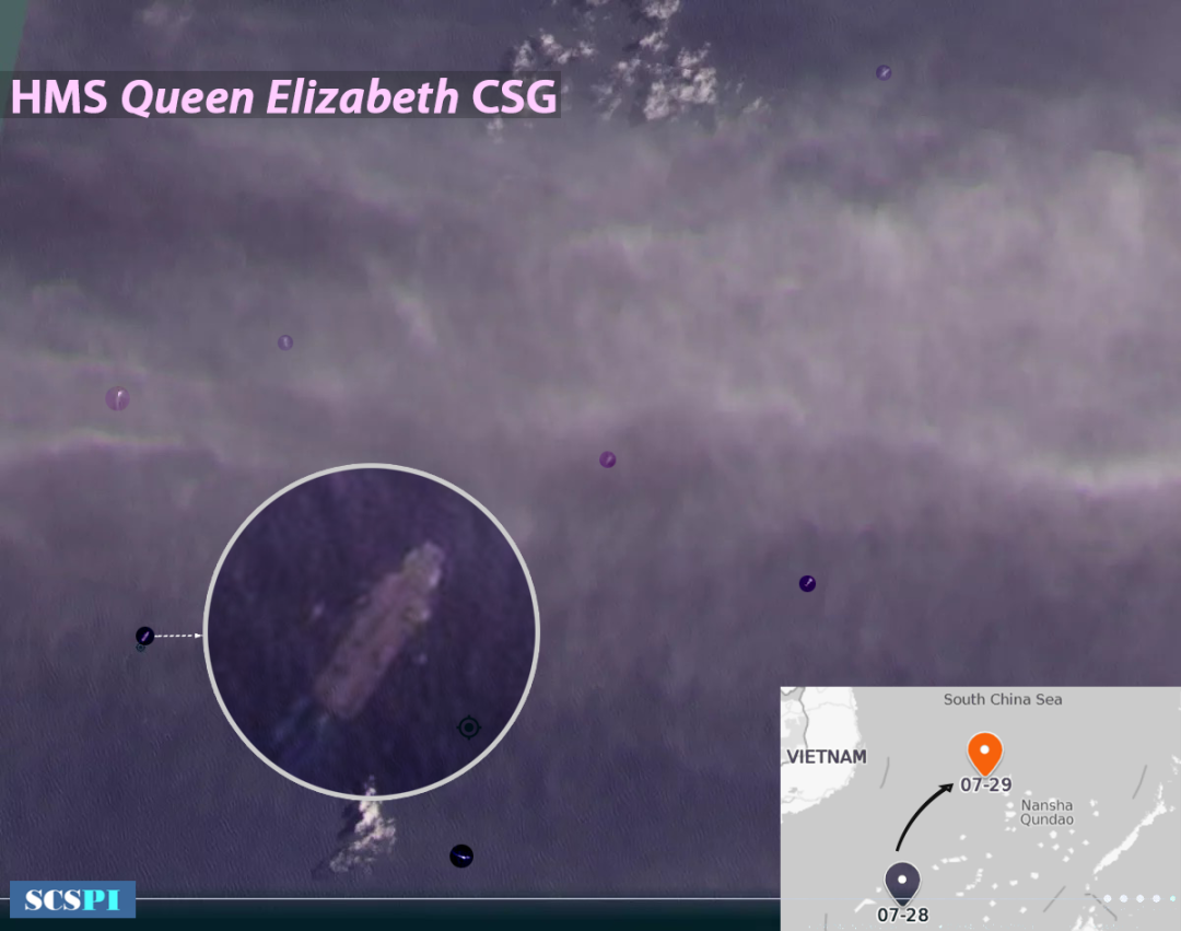 7月29日,英海軍“伊麗莎白女王”號航母打擊群在南海活動。圖:Planet衛星