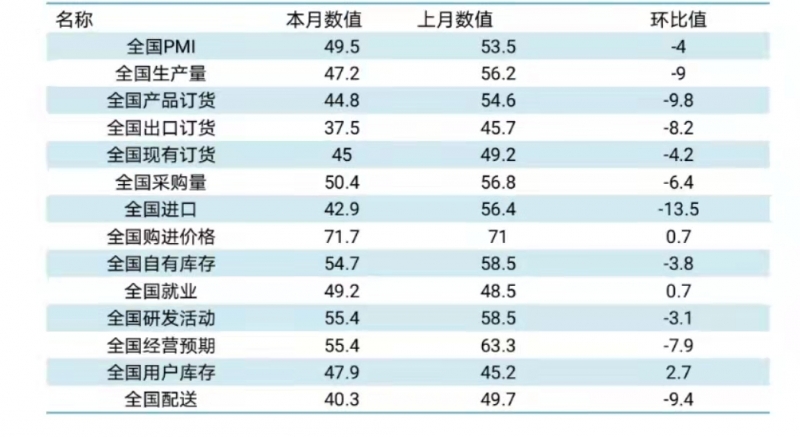 具體觀察各項指標,PMI指標為49.5%,比上月回落4個百分點。生產量指標為47.2%,比上月回落9個百分點。產品訂貨指標為44.8%,比上月回落9.8個百分點。進口指標為42.9%,比上月回落13.5個百分點。自有庫存指標為54.7%,比上月回落3.8個百分點。就業指標為49.2%,比上月回升0.7個百分點。