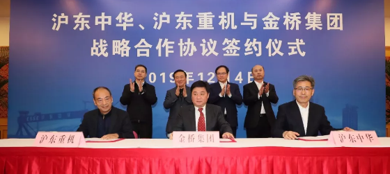 在楊金成、翁祖亮、馮永強、杭迎偉的共同見證下,中國船舶集團旗下滬東中華造船(集團)有限公司、滬東重機有限公司與上海金橋(集團)有限公司簽訂了戰略合作協議。