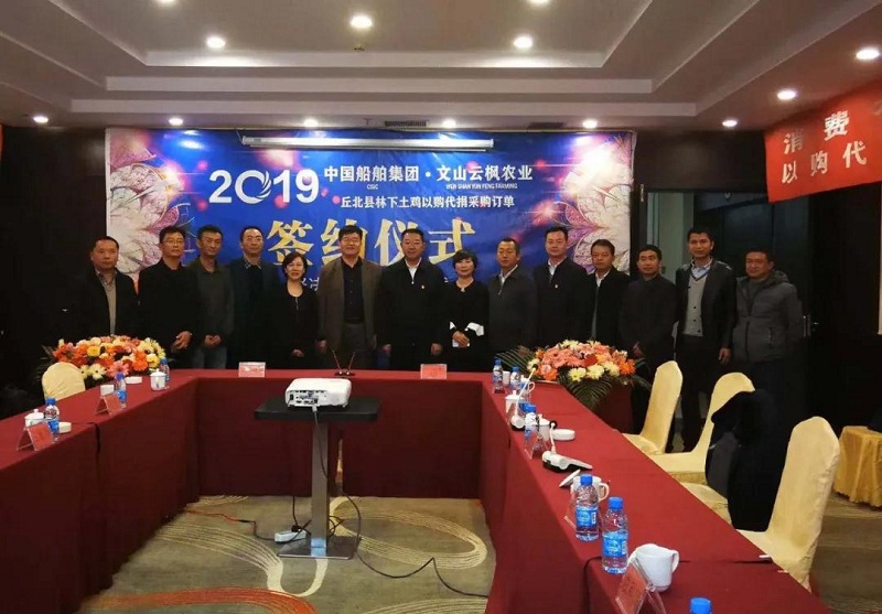2019年12月22日,中國船舶集團-雲南文山雲楓農業丘北縣林下養雞“以購代捐”采購訂單簽約儀式在雲南丘北縣舉行。