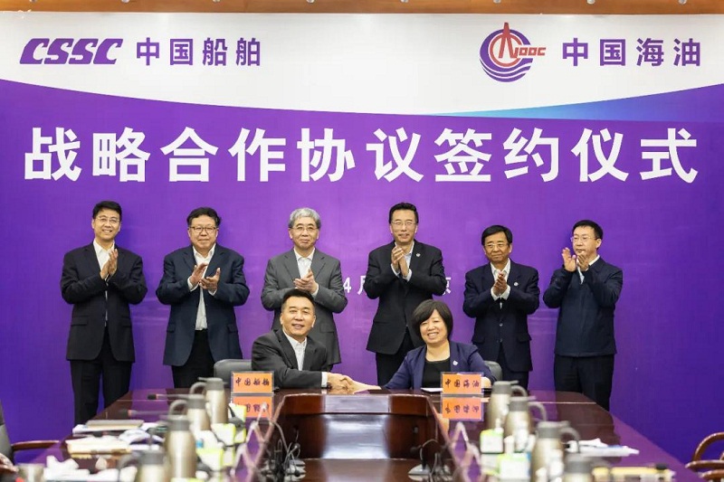 4月29日,中國船舶集團有限公司與中國海洋石油集團有限公司在京簽署戰略合作協議。中國船舶集團黨組書記、董事長雷凡培,中國海油黨組書記、董事長汪東進,中國船舶集團黨組成員、副總經理錢建平、杜剛,中國海油黨組成員、副總經理陳壁共同見證雙方簽約。中國船舶集團黨組成員、副總經理孫偉,中國海油黨組成員、總會計師溫冬芬分別代表雙方在協議上簽字。簽約前,雙方圍繞共同服務國家戰略,就進一步加強交流溝通、深化互利合作進行了深入交流並達成廣泛共識。
