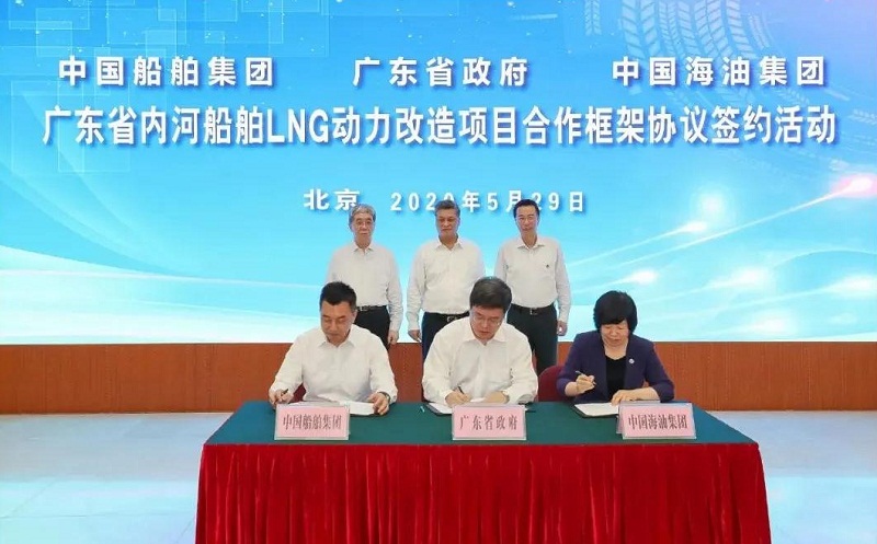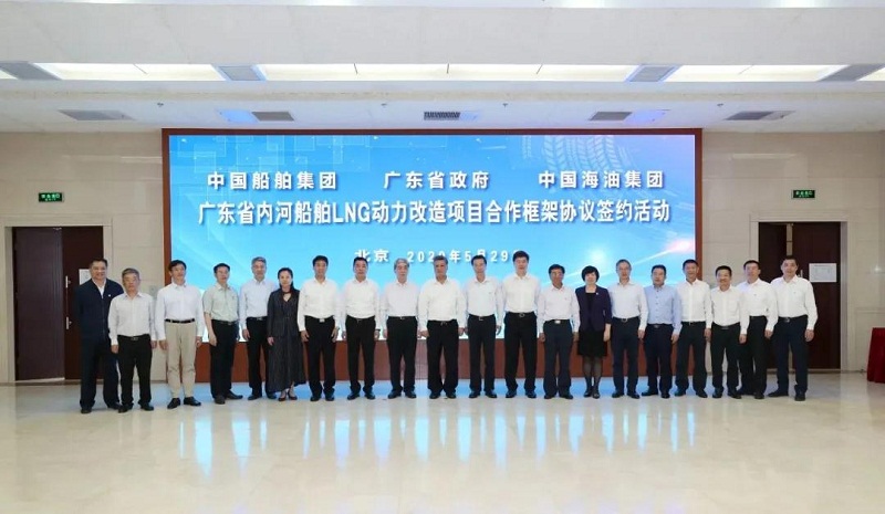 5月29日,中國船舶集團有限公司與廣東省人民政府、中國海洋石油有限公司在京簽署《廣東省內河船舶LNG動力改造項目合作框架協議》。廣東省委副書記、省長馬興瑞,中國船舶集團黨組書記、董事長雷凡培,中國海油黨組書記、董事長汪東進,中國船舶集團黨組成員、副總經理杜剛,中國海油黨組成員、副總經理陳壁出席簽約儀式。廣東省副省長覃偉中,中國船舶集團黨組成員、副總經理孫偉,中國海油黨組成員、總會計師溫冬芬分別代表各方在協議上簽字。