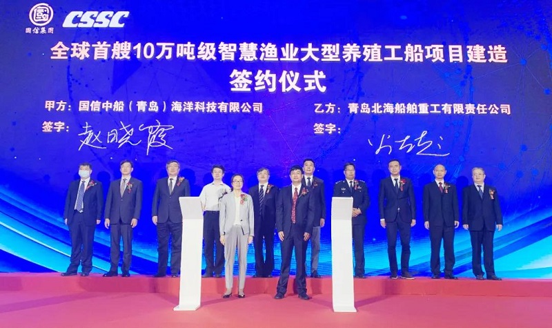 6月3日,中國船舶集團有限公司旗下武船集團青島北海船舶重工有限責任公司與國信中船(青島)海洋科技有限公司在青島西海新區正式簽署全球首艘10萬噸級智慧漁業大型養殖工船的建造合同。本次簽約標誌著養殖工船項目正式進入實質性建造階段,該船將於2022年3月交付。中國船舶集團黨組成員、副總經理孫偉,青島市副市長耿濤等領導和嘉賓出席簽約儀式。