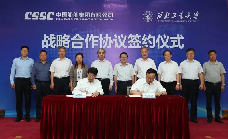 7月28日,中國船舶集團有限公司與西北工業大學在西安簽署戰略合作協議。中國船舶集團黨組書記、董事長雷凡培,西北工業大學黨委書記張煒、校長汪勁鬆出席簽約儀式。中國船舶集團黨組成員、副總經理杜剛,西北工業大學黨委常委、副校長宋保維分別代表雙方在協議上簽字。簽約後,雙方圍繞共同服務國家戰略,就加強戰略合作、推進協同創新、實現共同發展進行了深入交流。