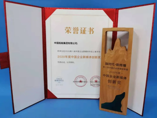 12月22日,由國務院國資委新聞中心、中央企業媒體聯盟聯合主辦的2020第八屆中國企業新媒體年會在北京舉行。本屆年會主題聚焦“融時代 · 新傳播”,中國船舶集團有限公司因在“奮鬥者”號融媒體報道中的創新表現,榮獲“2020年度中國企業新媒體創新獎”。