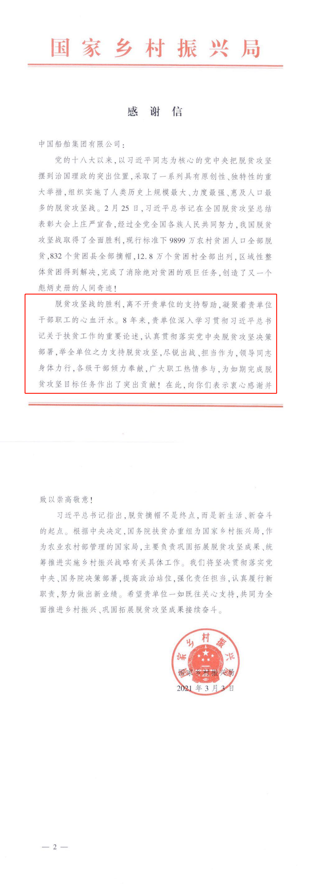 日前,中國船舶集團收到一封特殊的感謝信。信中對中國船舶集團8年來的擔當作為、傾情奉獻表示感謝和敬意,這封信來自不久前剛剛掛牌的國家鄉村振興局。