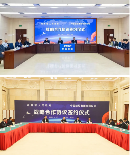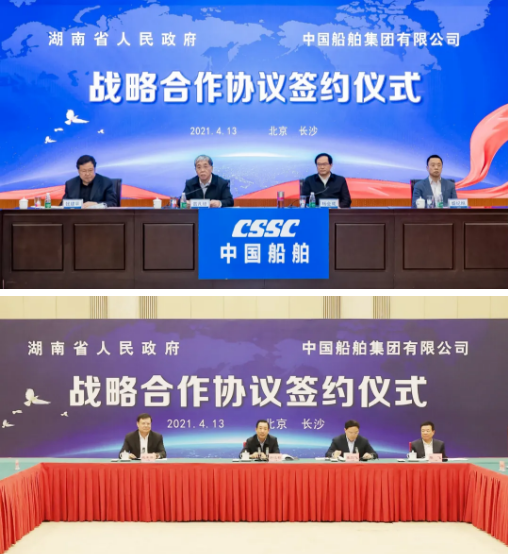4月13日,中國船舶集團有限公司與湖南省人民政府通過“雲簽約”方式簽署戰略合作協議。中國船舶集團黨組書記、董事長雷凡培,黨組副書記、總經理楊金成,黨組成員、副總經理盛紀綱,湖南省委書記、省人大常委會主任許達哲,省委常委、省委秘書長張劍飛,省委常委、省國資委黨委書記姚來英出席簽約儀式。中國船舶集團黨組成員、副總經理錢建平,湖南省人民政府副省長陳飛分別代表雙方在協議上簽字。簽約前,雙方圍繞共同服務國家戰略、深入推進雙方戰略合作進行了交流。