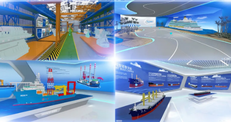 雲展廳運用360度全景3D建模、沉浸式場景以及實時渲染等領先創新技術,打造了高端3A(“Anybody、Anytime、Anywhere”)展示平台,特別是以實景還原的場景,動態展示大型郵輪、液化天然氣(LNG)船、雪龍2號、奮鬥者號等亮點產品,為參觀者營造了身臨其境的逼真效果。
