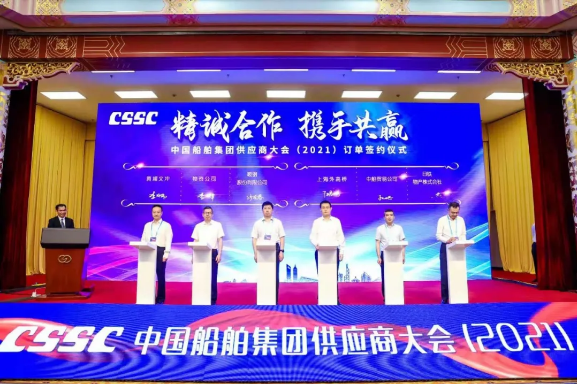 會上,中國船舶集團旗下成員單位分別與鞍鋼股份有限公司、山西太鋼不鏽鋼股份有限公司、日鐵物產株式會社等供應商進行了簽約,並為120多家金牌供應商頒發了證書。