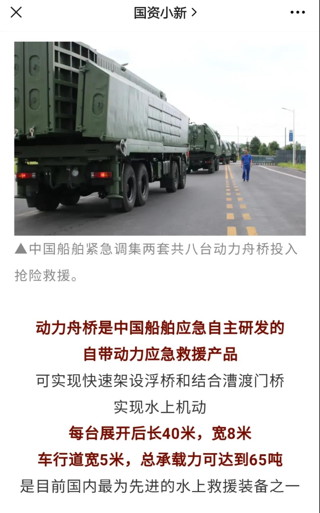 在本次搶險救援任務中,中船應急製造的應急動力舟橋被稱作“救援航母”,先後被多家媒體報道多次霸屏。