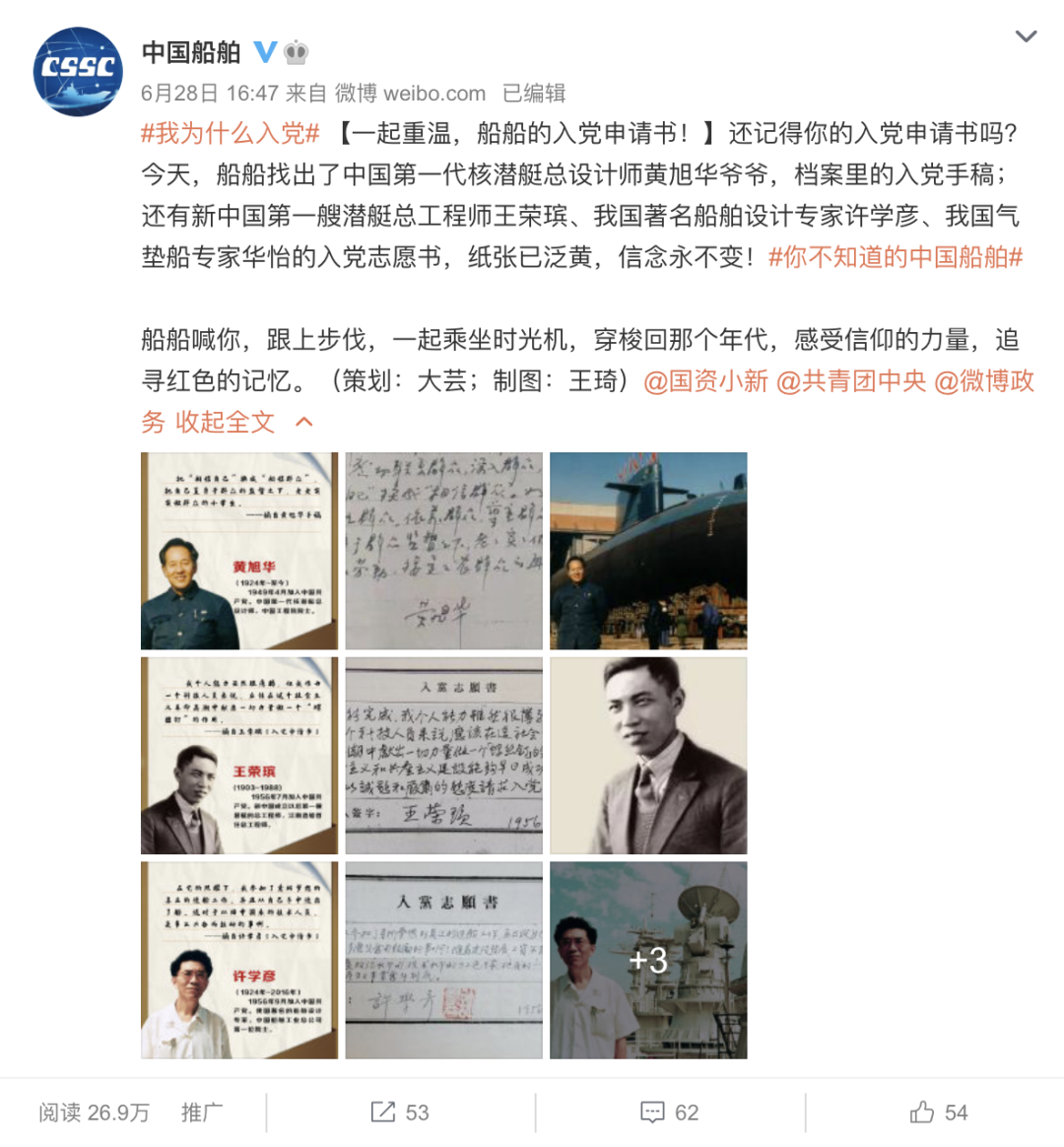 這篇微博展示了中國第一代核潛艇總設計師黃旭華、新中國第一艘潛艇總工程師王榮瑸、我國著名船舶設計專家許學彥、我國氣墊船專家華怡的親筆入黨誌願書,用一種時空穿越的方式,追尋一代人的紅色記憶,用船舶人的方式,慶祝建黨百年。