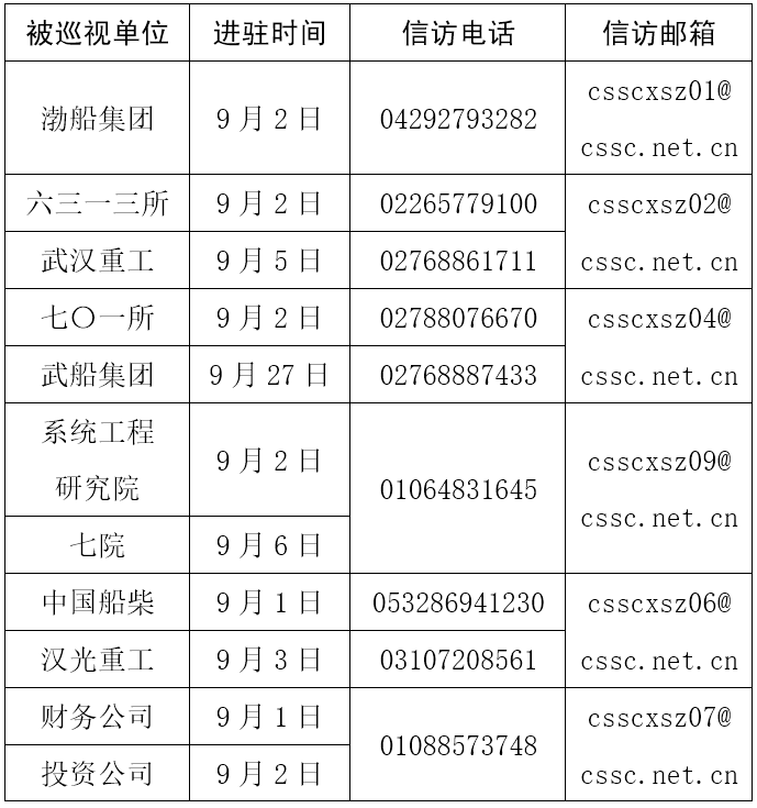 根據集團公司黨組對2021年第二輪巡視工作的統一部署,截至9月6日,集團公司黨組巡視組已基本完成進駐,對渤船集團等單位黨組織開展巡視,現場巡視約40天。 現場巡視期間,巡視組信訪電話如下: