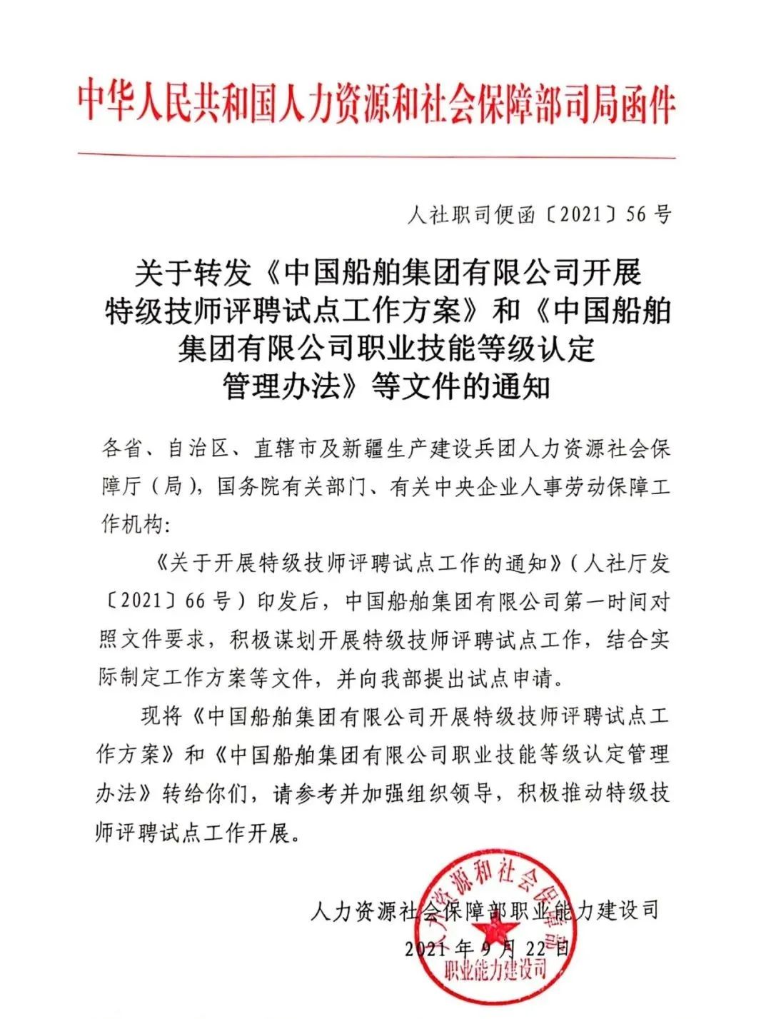 通知發布後,中國船舶集團第一時間對照文件要求,積極謀劃開展特級技師評聘試點工作,集團公司黨組審議出台《職業技能等級認定管理辦法》,進一步明確以“特級技師”為塔尖的六個技能等級,第一時間製定特級評聘工作方案,積極向人社部申報特級技師評聘試點。同時部署了2021年特級技師評審工作,今年計劃增加80名左右特級技師。