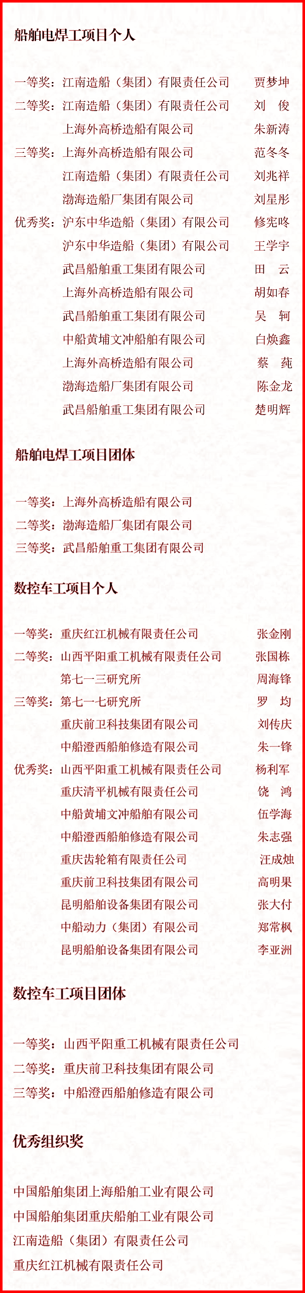 本次競賽是中國船舶集團有限公司組建以來舉辦的首屆職業技能競賽,競賽項目既有船舶行業主體工種——船舶電焊工,又有現代製造業重要工種——數控車工。競賽由上海公司、江南造船、重慶公司、重慶紅江等四家單位承辦。參賽選手們相互學習交流、深入切磋技藝,展現了中國船舶技能人才頑強拚搏、追求卓越的良好精神麵貌!