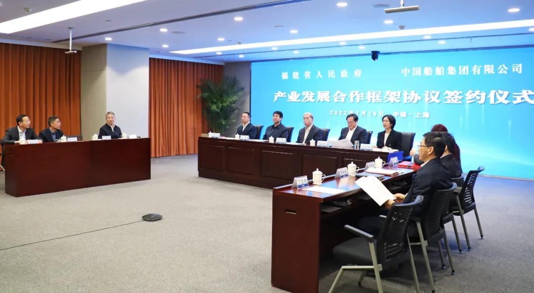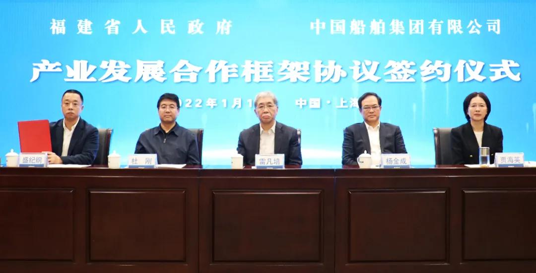 1月18日,中國船舶集團有限公司與福建省人民政府通過“雲簽約”方式簽署戰略合作協議。中國船舶集團黨組書記、董事長雷凡培,黨組副書記、總經理楊金成,黨組副書記、董事杜剛,黨組成員、總會計師賈海英,黨組成員、副總經理盛紀綱;福建省委書記尹力,省委副書記、代省長趙龍,省委常委、常務副省長郭寧寧,省委常委、秘書長吳偕林,副省長康濤出席簽約儀式。盛紀綱、郭寧寧分別代表雙方在協議上簽字。