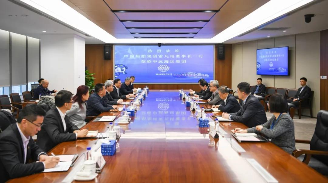 2月9日,中國船舶集團有限公司黨組書記、董事長雷凡培,黨組副書記、總經理楊金成一行赴中遠海運大廈拜會中國遠洋海運集團有限公司黨組書記、董事長萬敏,黨組副書記、總經理付剛峰。雙方互賀壬寅虎年新春,圍繞深入貫徹落實國家重大戰略,就進一步加強綠色燃料技術研發應用、船chuan舶bo與yu航hang運yun業ye全quan產chan業ye鏈lian構gou建jian等deng領ling域yu的de交jiao流liu合he作zuo,攜xie手shou推tui動dong我wo國guo航hang運yun業ye和he造zao船chuan業ye高gao質zhi量liang發fa展zhan進jin行xing了le深shen入ru探tan討tao並bing達da成cheng廣guang泛fan共gong識shi。中zhong國guo船chuan舶bo集ji團tuan黨dang組zu成cheng員yuan、副總經理孫偉、盛紀綱,中遠海運集團黨組成員、副總經理、總會計師孫雲飛參加會談。