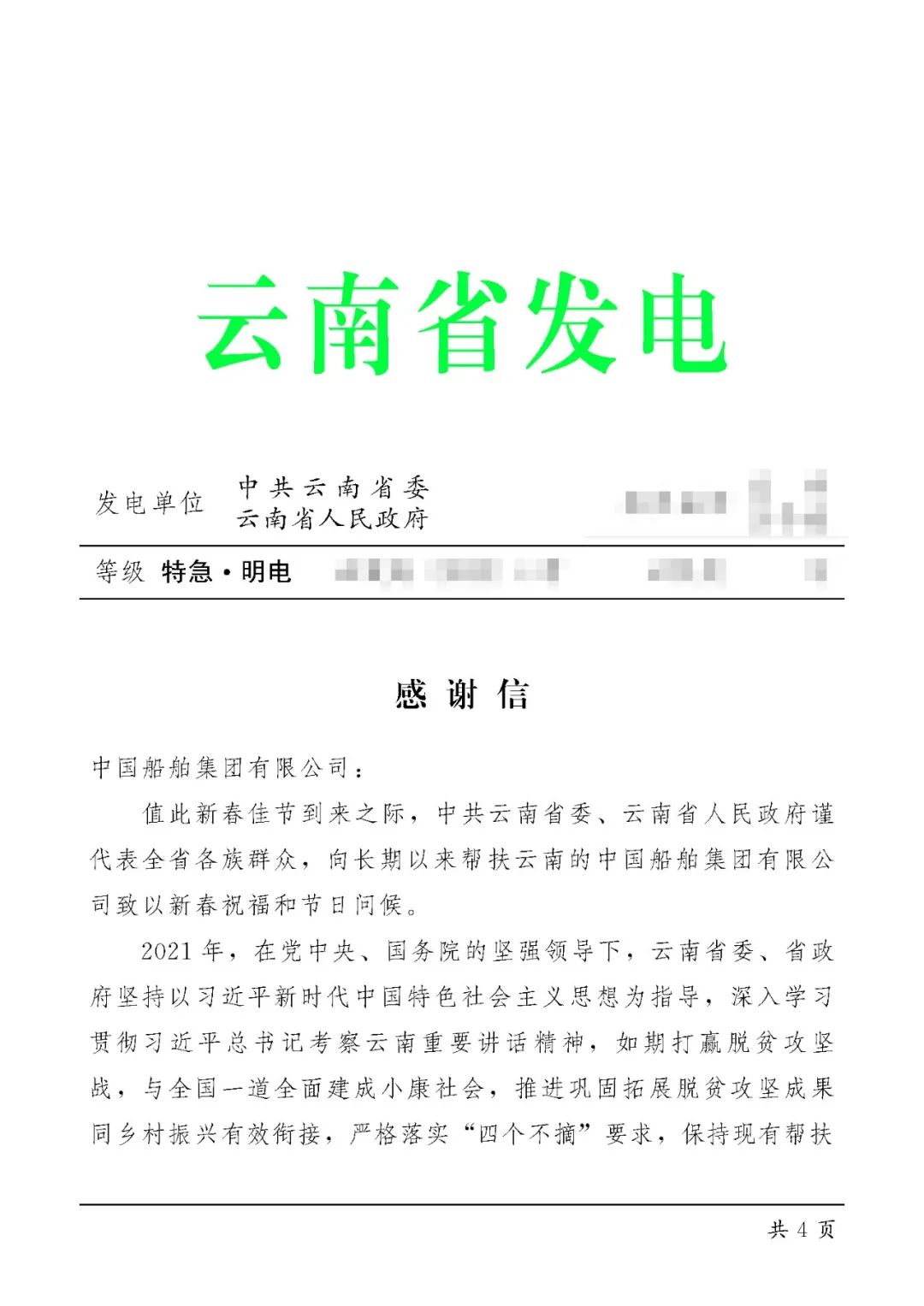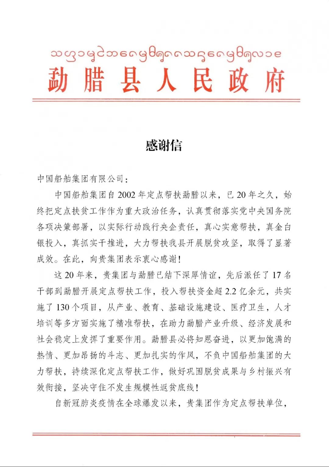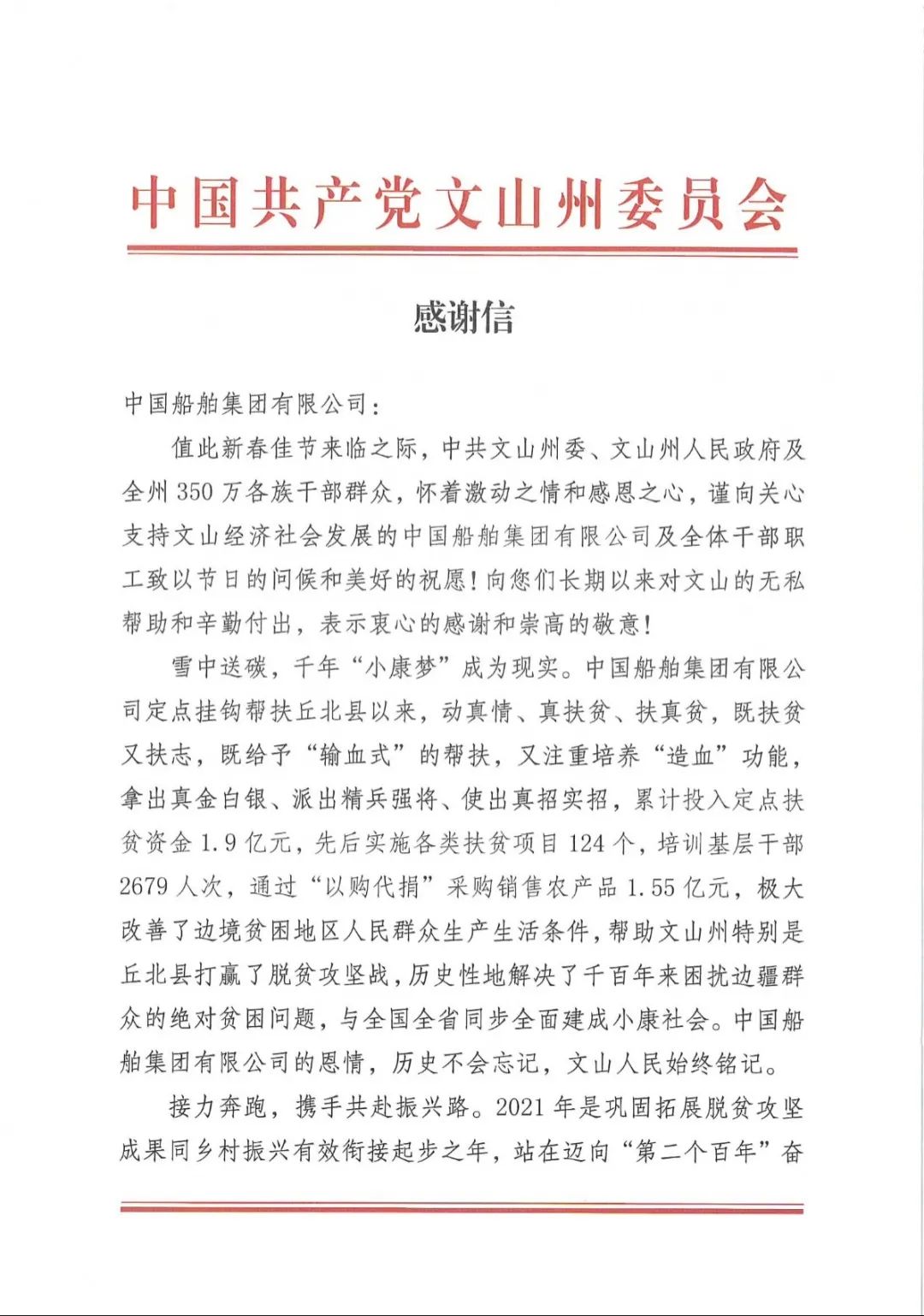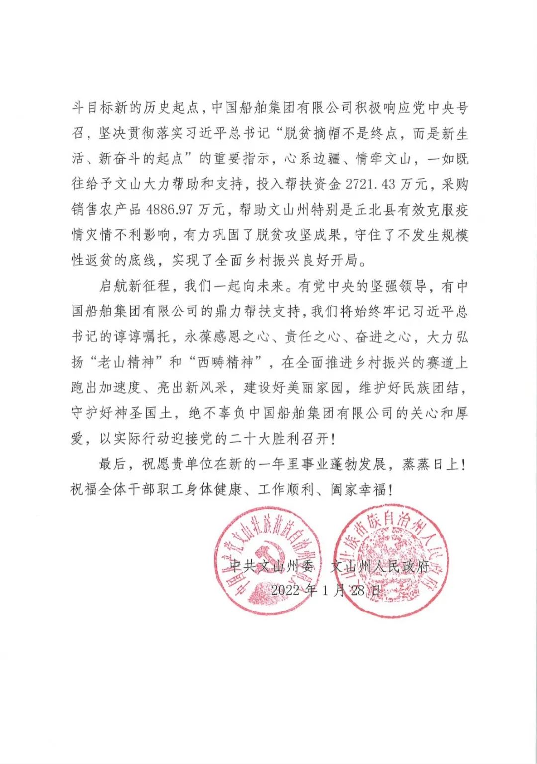 春節前夕,中國船舶集團陸續收到雲南省委省政府、文山州委州政府、鶴慶縣委縣政府、猛臘縣政府發來的感謝信,對集團公司長期以來給予鶴慶縣、猛臘縣、丘北縣的傾力幫扶表示衷心感謝和崇高敬意。
