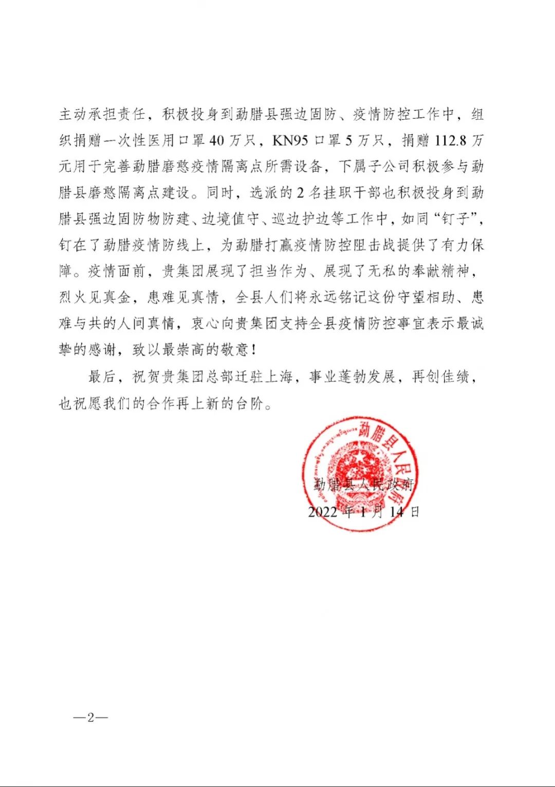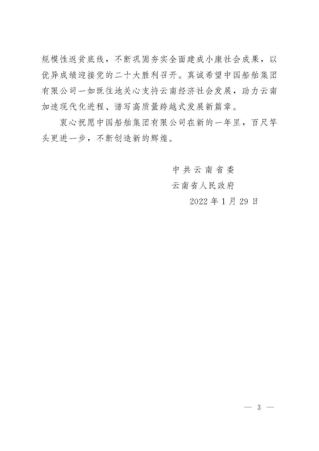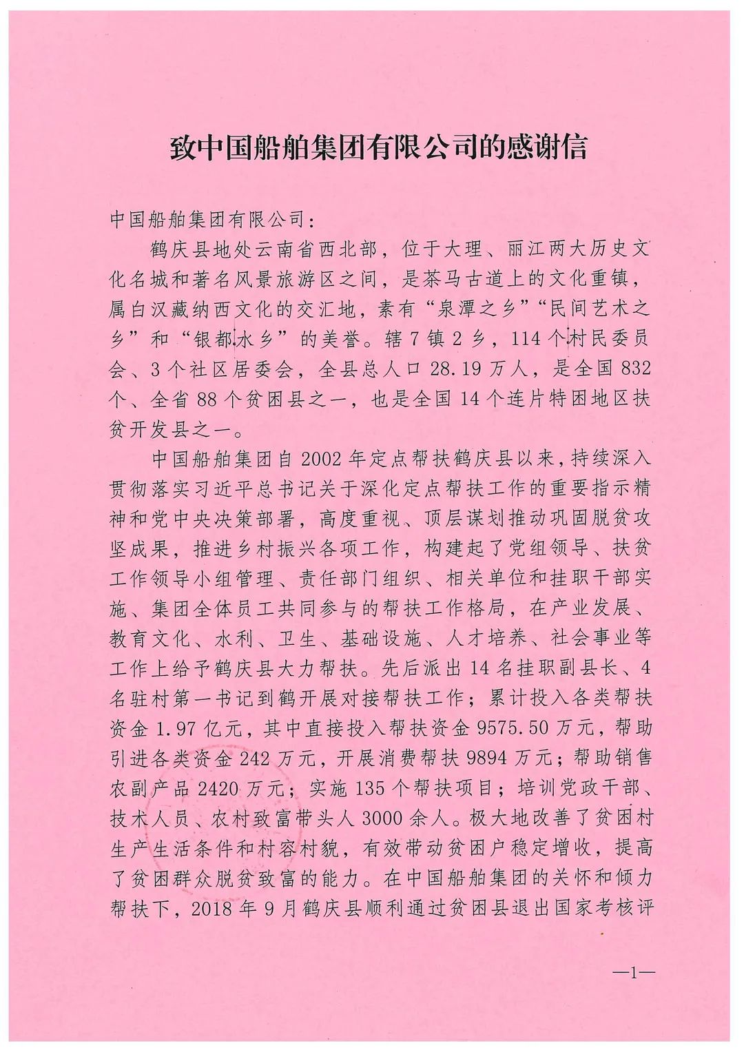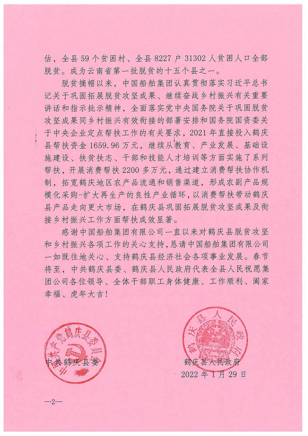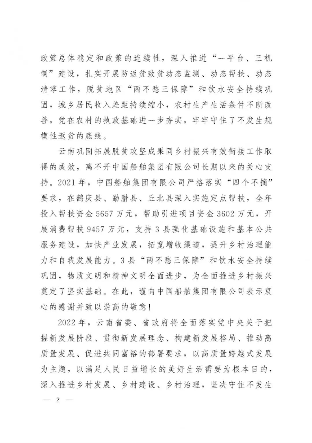 春節前夕,中國船舶集團陸續收到雲南省委省政府、文山州委州政府、鶴慶縣委縣政府、猛臘縣政府發來的感謝信,對集團公司長期以來給予鶴慶縣、猛臘縣、丘北縣的傾力幫扶表示衷心感謝和崇高敬意。