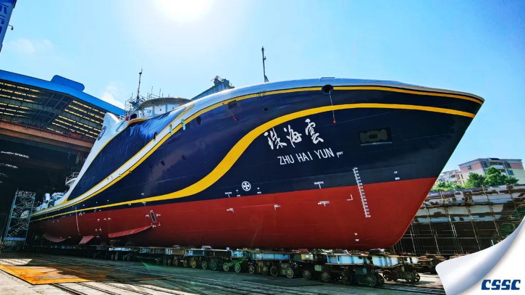 黃埔文衝建造的全球首艘智能型無人係統科考船“珠海雲”號下水。這科幻的外表又似一頭巨大的鯨魚躍出海麵。