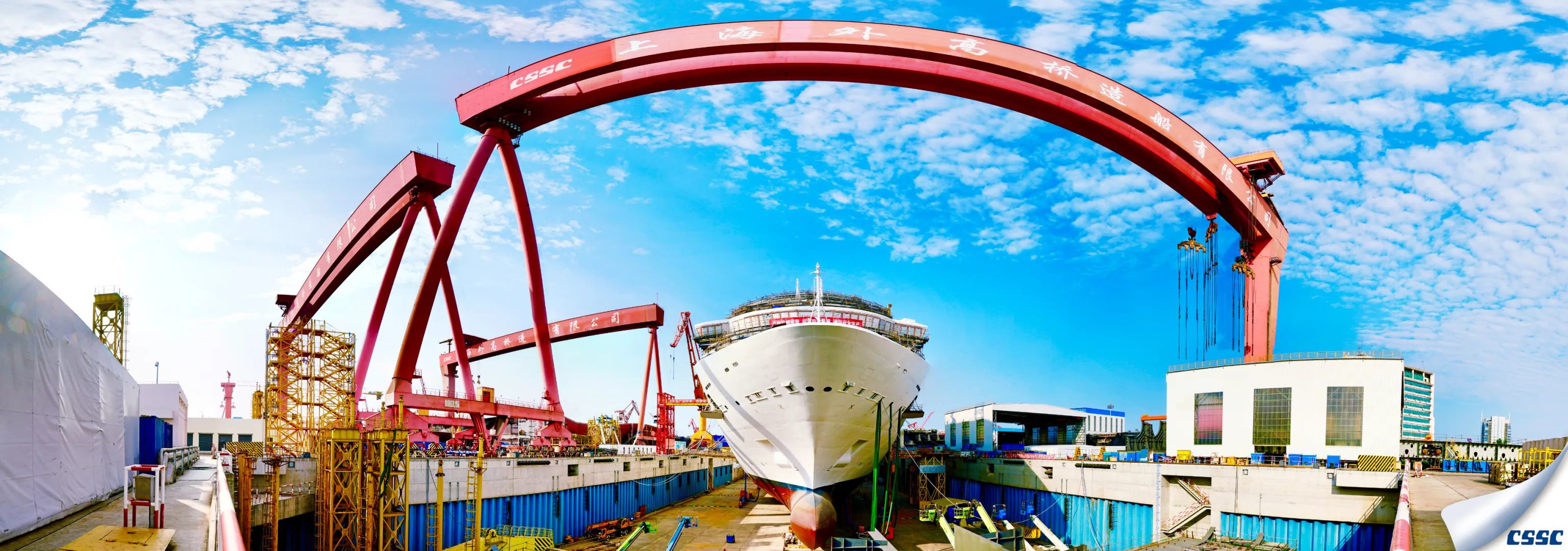 豔陽下的外高橋造船基地,半遮麵紗的中國首製大型郵輪矗立其中,天地之間都似是她的舞台,讓我們翹首以待她真正的芳容吧。