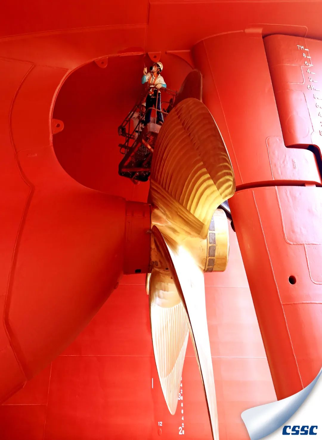 新船出塢前,造船工人對船舶外貌進行補漆,以最靚麗的姿態迎接船舶出塢。