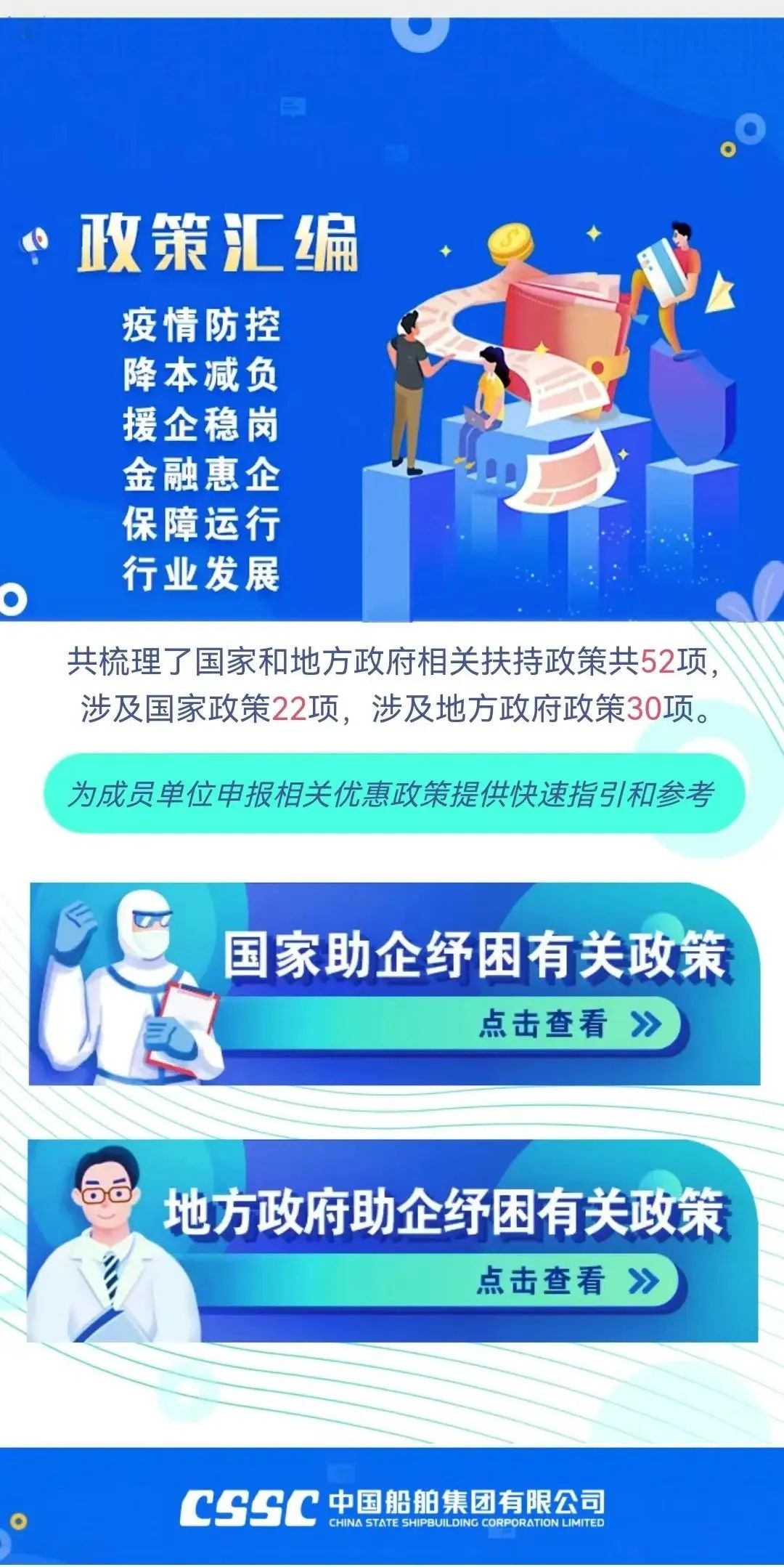 今年新冠疫情發生以來,為支持企業應對疫情防控、加快複工達產,國務院、相關部門、相關地方政府出台了一係列助企紓困政策。集團公司對這些政策進行了梳理,共涉及相關支持政策52項(其中,國家支持政策22項地方支持政策30項),供成員單位查閱參考。 點擊閱讀原文,了解更多。