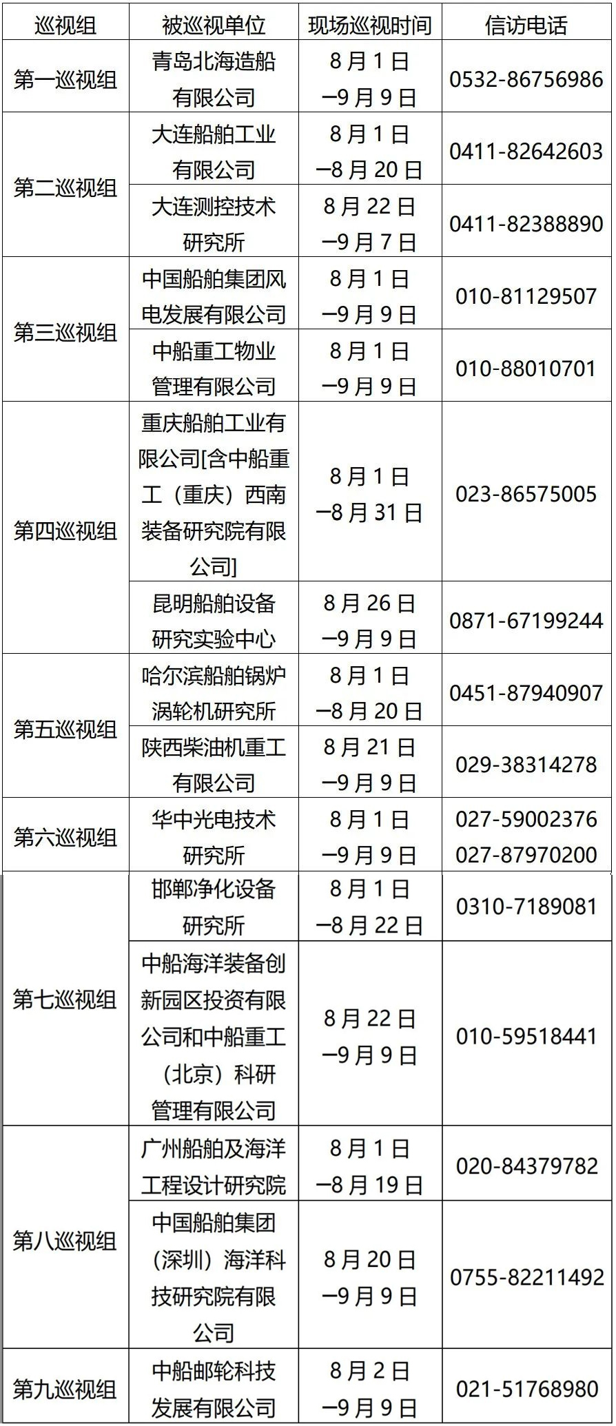 根據中國船舶集團黨組2022年第一輪巡視工作部署,截至2022年8月2日,中國船舶集團黨組9個巡視組已進駐青島北海造船有限公司、大連船舶工業有限公司、中國船舶集團風電發展有限公司、中船重工物業管理有限公司、重慶船舶工業有限公司[含中船重工(重慶)西南裝備研究院有限公司]、哈爾濱船舶鍋爐渦輪機研究所、華中光電技術研究所、邯鄲淨化設備研究所、廣州船舶及海洋工程設計研究院、中船郵輪科技發展有限公司等單位,對其黨組織開展為期40天左右的現場巡視。巡視期間,巡視組設置專門值班電話(具體如下表)。同時在巡視組工作現場設置聯係信箱,廣大幹部職工可以反映情況。