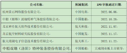 2022年的資本市場,行情不熱行業熱。從已經公開披露的信息看,2022年中央企業專精特新小巨人在科創板和創業板持續發力,目前已有中無人機(航空工業)、國博電子(中國電科)、振華風光(中國電子)、昆船智能等7家企業IPO上市。此外,截至2022年11月30日,已有多家央企專精特新企業IPO申請通過了科創板上市委審核和創業板上市輔導,其中有兩家中國船舶集團旗下企業(見下表)。這些企業將在2023年IPO上市,主要來自船舶、航空、航天和軍工電子行業。