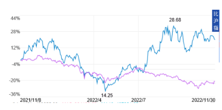很顯然,中船係憑其創新和產業鏈優勢已成為中國資本市場一股新生力量。中國船舶集團龍頭股中國船舶(600150)2022年11月30日收盤價比去年同期上漲約20%,跑贏大市。下圖為2022年11月30日中國船舶與滬深300指數漲跌對比圖,上部曲線為中國船舶,下部曲線為滬深300。