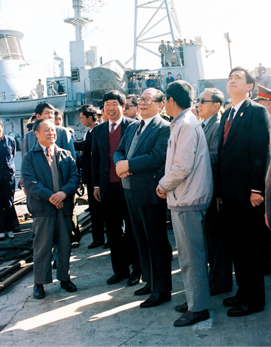 江澤民同誌曾先後三次到江南造船視察。圖為1994年4月29日,江澤民同誌視察江南造船。據相關人士回憶,當時江澤民同誌視察江南有兩個原因,一是“五一”節快要到了,江澤民同誌要看望工人階級,就選擇了江南造船,因為江南造船是產業工人的搖籃;第二個原因是112艦計劃當年5月8日前交艦,交艦前江澤民同誌要先視察。