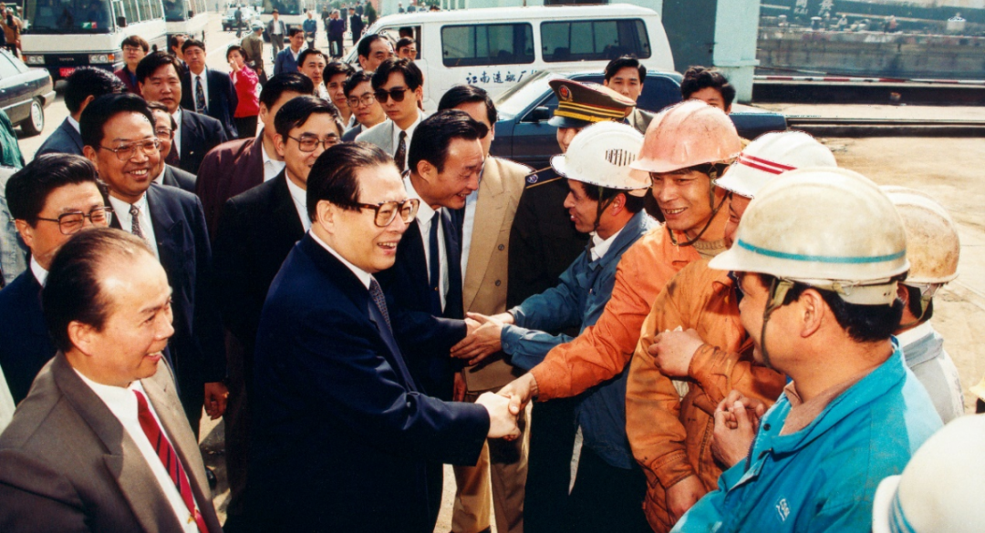 1994年4月29日,江澤民同誌在視察江南造船時看望工人。