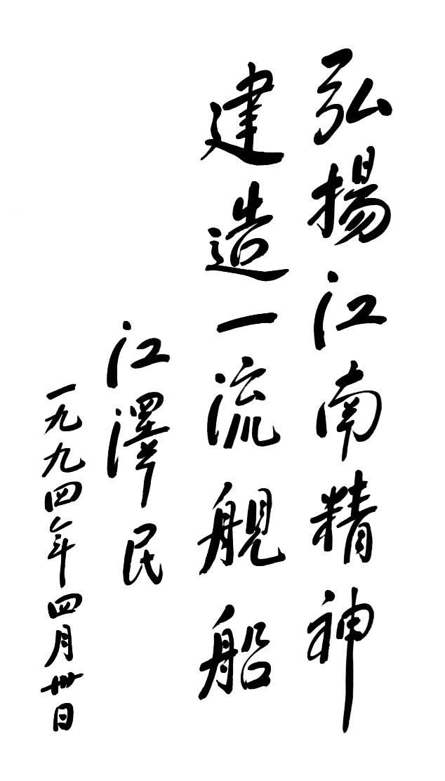 1994年4月30日,江澤民同誌為江南造船題詞“弘揚江南精神,建造一流艦船”。