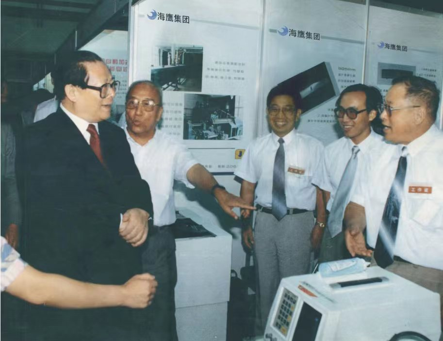 江澤民同誌曾參觀係統工程研究院、中船電科旗下海鷹公司產品。圖為1995年,江澤民同誌參觀海鷹公司展台。