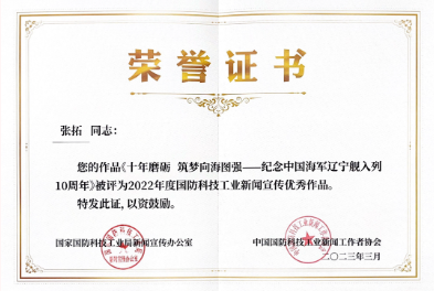 會議對2022年度國防科技工業新聞宣傳優秀作品、優秀案例、優秀個人、優秀組織代表進行現場表彰。中國船舶集團黨群工作部選送的《十年磨礪 築夢向海圖強——紀念中國海軍遼寧艦入列10周年》獲評2022年度國防科技工業新聞宣傳優秀作品、《中國船舶集團定點幫扶雲南20年之全媒體——微博、抖音、微信、報紙走基層報道》獲評2022年度國防科技工業新聞宣傳優秀案例,中國船舶集團旗下滬東中華張文豪獲評2022年度國防科技工業新聞宣傳優秀個人,中國船舶集團旗下中國船舶報社獲評2022年度國防科技工業新聞宣傳優秀組織。