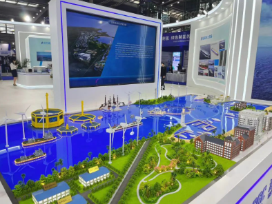 # 10萬噸級大型深遠海養殖工船、2000噸自升自航式風電安裝平台、耕海一號二期工程等模型以及“藍色海洋經濟綜合體”沙盤,生動展示出“深海養殖+海上文旅+海上風電”互聯互通的繁榮業態景象;