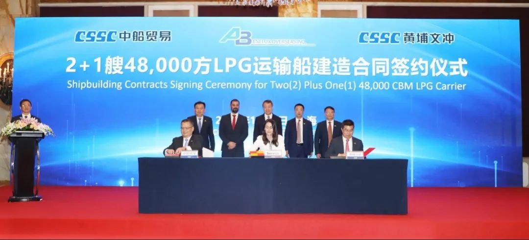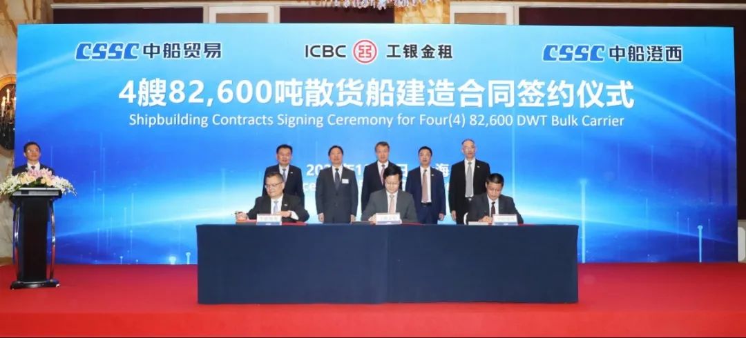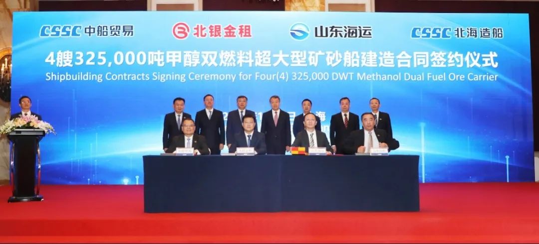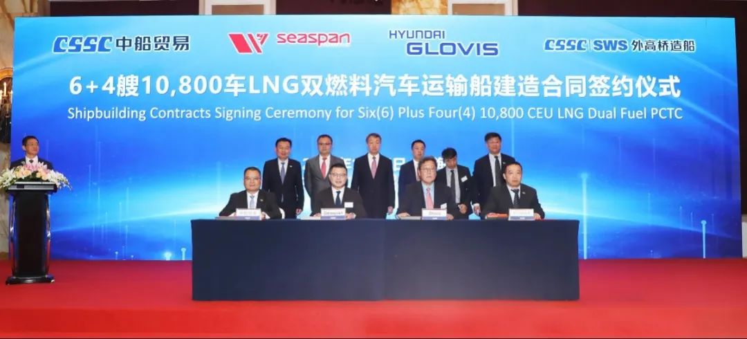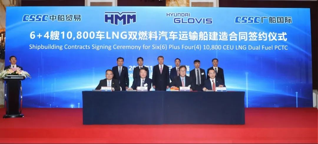 簽約儀式上,外高橋造船、中船貿易與Seaspan、現代Glovis簽署了6+4艘10800車LNG雙燃料PCTC船項目;廣船國際、中船貿易與HMM、現代Glovis簽署了6+4艘10800車LNG雙燃料PCTC船項目;北海造船、中船貿易與北銀金租、山東海運簽署了4艘325000噸超⼤型甲醇雙燃料礦砂船項目;江南造船、中船貿易與太平洋氣體簽署了3艘99000方VLEC船項目;黃埔文衝、中船貿易與Benelux公司簽署了2+1艘48000方LPG船項目;中船澄西、中船貿易與工銀金租簽署了4艘82600噸散貨船項目;大連造船與七二五所青島雙瑞簽署了15000TEU集裝箱船甲醇供應係統項目。