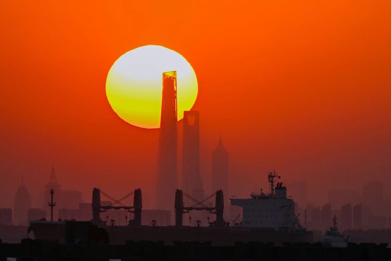 從距離陸家嘴33公裏遠的橫沙島上遠眺“三件套”,夕陽從“三件套”穿過,此時一艘船駛入畫麵,與夕陽形成近中遠三景。