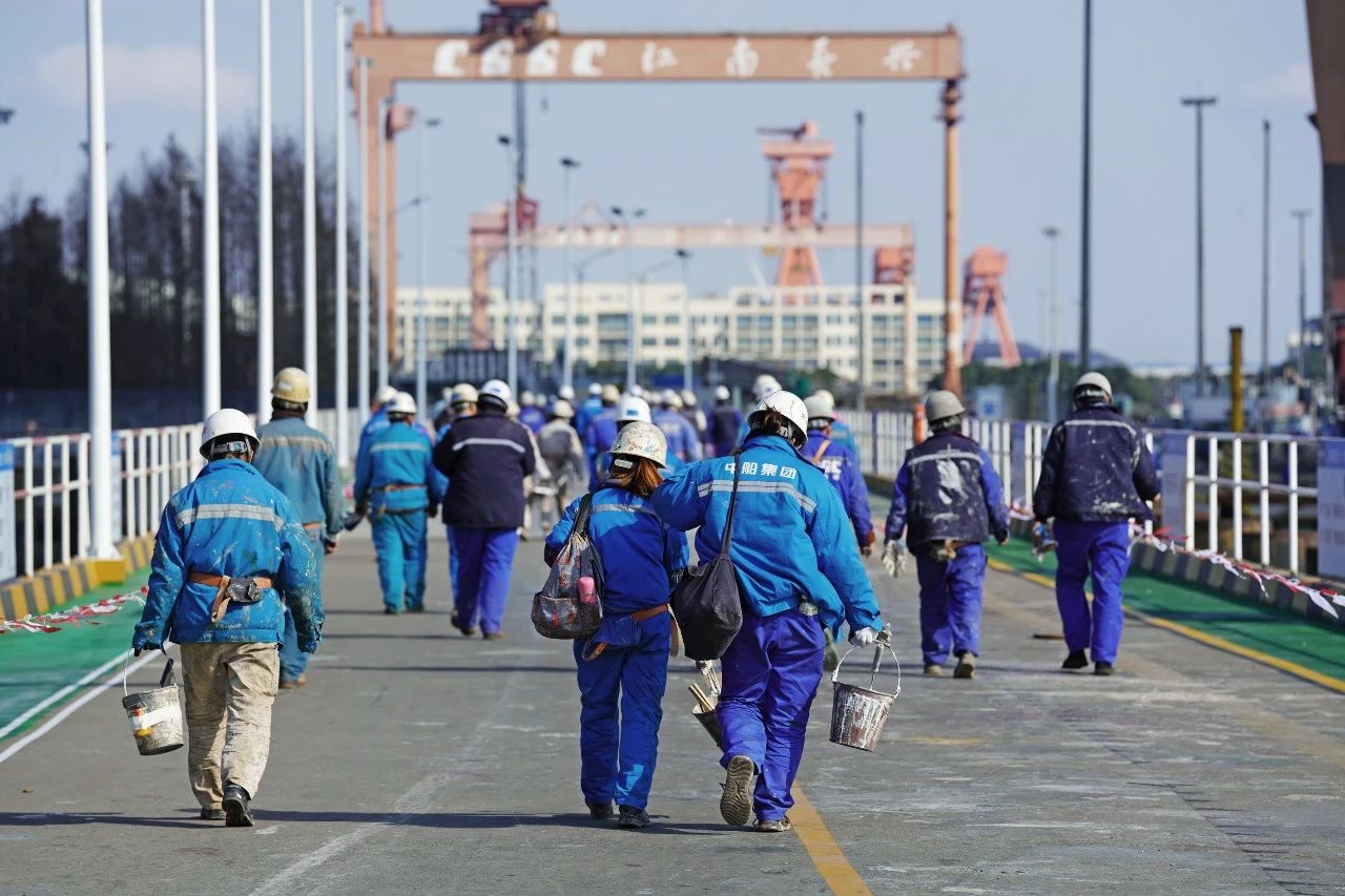 在碼頭上,午休時間,一線工人拎著工作工具,互相交談著,亦或是搭著肩膀,一起下班。