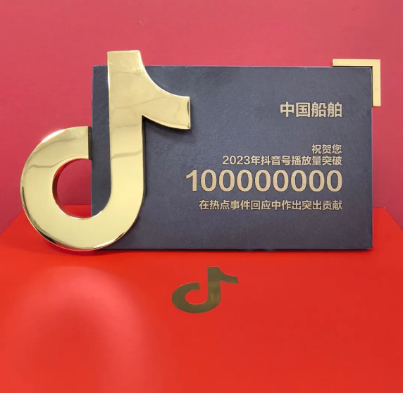 “中國船舶”抖音自2022年3月正式開通以來,粉絲數突破100萬大關。截至2023年12月,“中國船舶”抖音總播放量約5.8億,播放量破100萬視頻50條、破1000萬視頻7條、單條最高5200萬,爆款視頻10餘條,多次成為社會性熱點新聞,全網轉發。在2023年國資小新發布的新媒體指數月度排行榜中,抖音平台兩次排名第一。