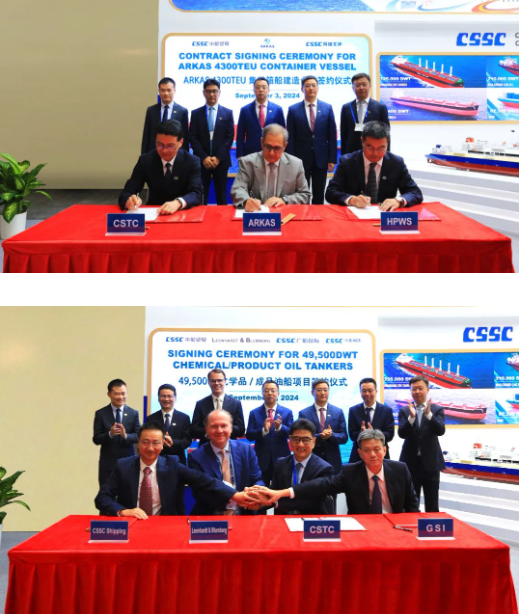 此次展會上,集團公司有關成員單位負責人率隊赴展會開展重點船海項目經營洽談並拜訪當地和周邊國家主要客戶。集團公司以“高端綠色、領跑未來”為參展主題,展台設置了集團總體區、高端綠色船舶區、先進動力配套區共3個展示區域,重點展示了首艘國產大型郵輪、27.1萬立方米超大型LNG(液化天然氣)運輸船、10800車LNG雙燃料汽車運輸船、全球首艘LNG雙燃料VLCC(超大型油船)、21萬噸氨燃料散貨船、9.3萬立方米超大型全冷式液化氣船等一係列技術含量高、全球競爭力強的高端綠色船型,以及CPGC-WinGD 10X92DF-M甲醇雙燃料發動機、船用供氣係統、船用碳捕捉係統、船舶新能源動力係統解決方案等滿足IMO(國際海事組織)當前和未來排放要求的先進動力配套設備,充分彰顯了中國船舶集團的國際化品牌形象及引領國際船舶市場創新發展的澎湃動力。