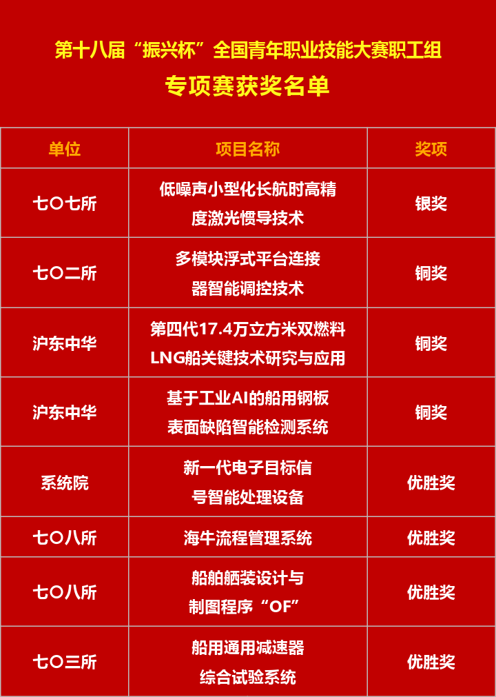 11月15日,第十八屆“振興杯”全國青年職業技能大賽職工組全國決賽在沈陽落下帷幕,中國船舶集團青年取得主體賽(職業技能競賽)“1銀2銅7優勝獎”、專項賽(創新創效競賽)“1銀3銅4優勝獎”的好成績。其中,黃埔文衝吳道升、七〇七所“低噪聲小型化長航時高精度激光慣導技術”項目分獲銀獎,在“青春競技場”上展現了船舶青年的自信卓越風采。