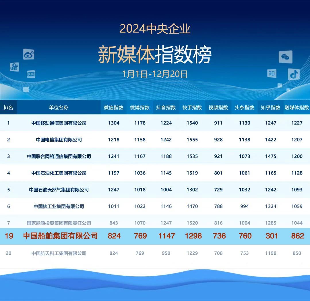 2024年——中船集團新媒體平台綜合指數進入2024年度中央企業新媒體指數榜前20!