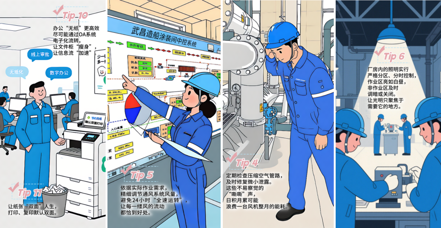 武昌造船在節能宣傳周期間組織開展了“船廠節能秘籍”征集活動,以船廠員工的一天為軸線,收集到各類節能基本操作,形成了《這些基本操作,我知道你一定能做到》宣傳材料,並通過公司公眾號發布,向員工普及節能知識與技巧,擴大節能宣傳覆蓋麵。同時開展 “停用空調”能源緊缺體驗行動,倡議全體員工在全國低碳日,關閉辦公室、會議室及非必要區域空調設備,通過實際行動感受能源緊缺,踐行節能理念,進一步增強員工資源憂患意識。