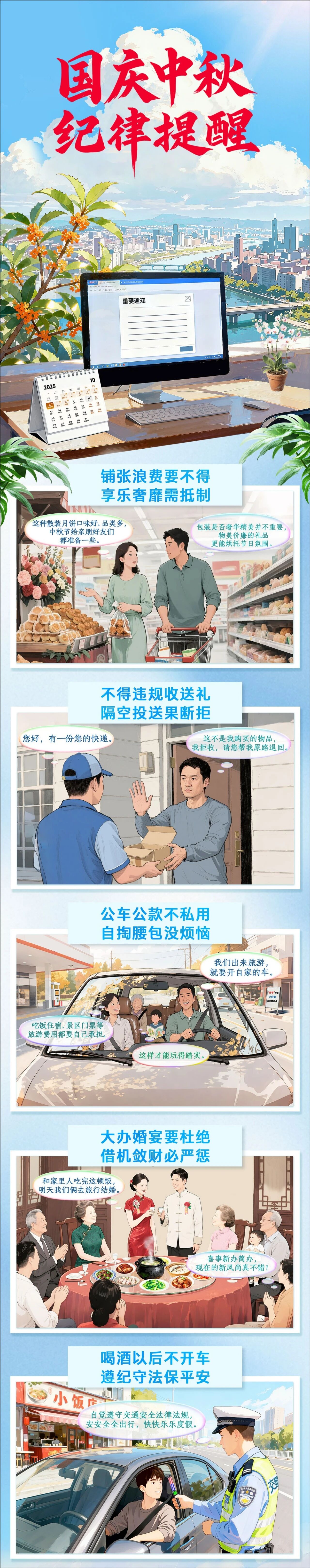 中秋月圓映初心 家國同慶話清風 2025年國慶與中秋雙節將至 在這團圓歡慶的時刻 我們要 持續加固中央八項規定精神堤壩 嚴防 “四風” 問題反彈回潮 全體黨員幹部員工 繃緊紀律之弦,守住廉潔底線 讓節日氛圍更純粹 讓清風正氣滿乾坤